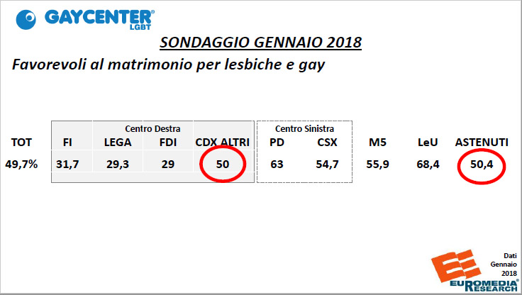 Quanto è diffusa la sensibilità sui temi lgbt tra gli elettori e le lettrici italiane? E soprattutto, com’è distribuito tra le forze politiche l’elettorato tendenzialmente friendly? Mentre ancora non sono pronti tutti i programmi dei partiti e delle coalizioni che si presenteranno alle elezioni politiche del 4 marzo, a rivelare questo dati è un sondaggio svolto da Euromedia Research su commissione del Gay Center.