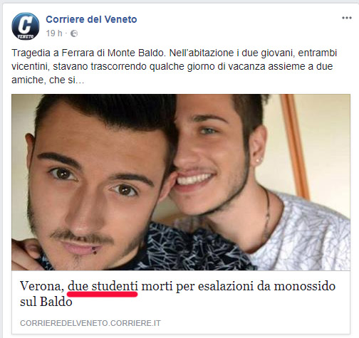 “Quando due giovani vite vengono interrotte il dolore ammutolisce – ha scritto in un post su Facebook il comitato vicentino di Arcigay -, ma non al punto tale da non chiedere al Corriere del Veneto ed al Il Giornale di Vicenza.it di portare ad Alex e Luca rispetto e chiamarli come volevano essere chiamati: #fidanzati. Anche loro erano una famiglia, e definirli “amici” è irrispettoso”. “Fidanzati e non “amici”. Basta ad omofobia interiorizzata stampa italiana – ha rilanciato su Twitter la senatrice Cirinnà -. Il Paese è cambiato, @corriereveneto e @GiornaleVicenza”.