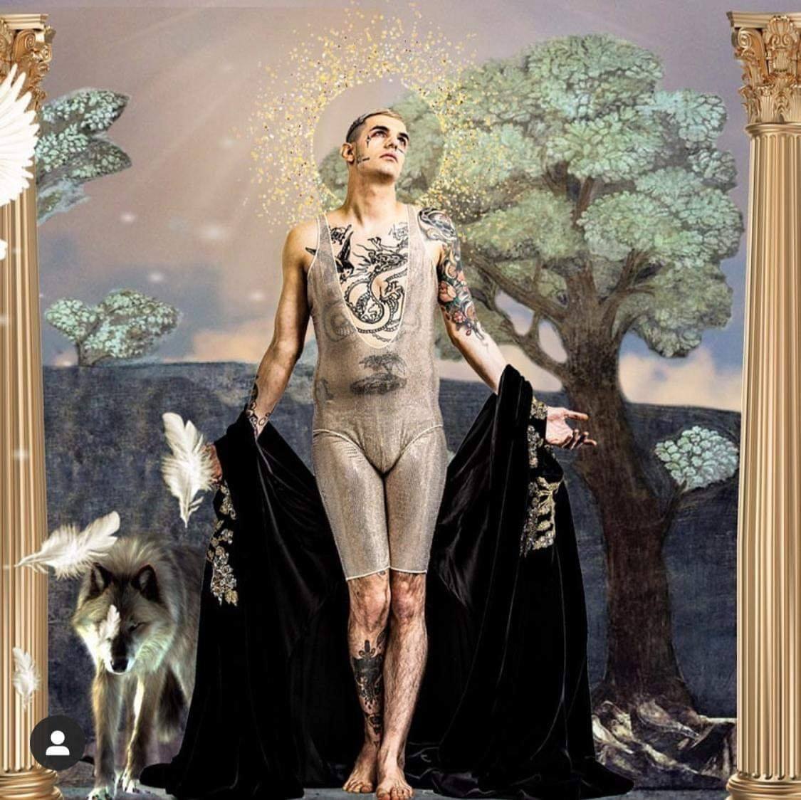 Or bene, l’esibizione di Achille Lauro è una citazione. L’arte non è fatta solo di invenzioni originali, ma a volte si serve del riuso – chiamato citazione, appunto – da non confondere con la scopiazzatura (che invece è plagio). In un’altra immagine vediamo il cantante che toglie il mantello, mostrandosi quanto più nudo possibile. Sullo sfondo, alcuni alberi disegnati in stile giottesco, come ne La predica agli uccelli. Accanto a lui un lupo, chiaro riferimento alla vita del santo e a Gubbio. Ma per dare un contesto a questo tipo di rappresentazione, per niente sacra, ma che richiama la sacralità dell’essere (soprattutto all’essere non binario) bisogna leggere alcune sue dichiarazioni che chiariscono il pensiero dell’artista, esposto in un suo libro dal titolo Sono io Amleto.