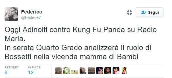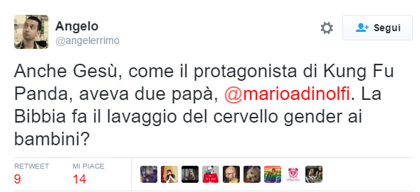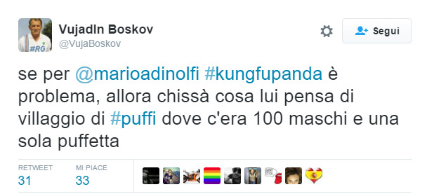 “Volete capire come si fa il lavaggio del cervello gender ai bambini? – ha tuonato Mario Adinolfi su Facebook su Facebook- Ad esempio con il protagonista di Kung Fu Panda che ha due papà”.