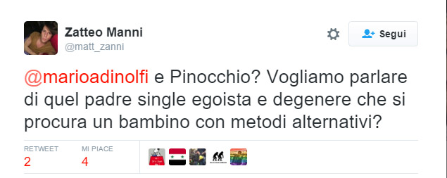 Oggi Mario Adinolfi ci ha deliziato con un nuovo “allarme-gender”. Questa volta il candidato sindaco di Roma ha preso di mira il cartone animato Kung Fu Panda 3 -da giovedì nei cinema italiani- reo di portare sul grande schermo una famiglia diversa dal modello “Mulino Bianco”: il protagonista viene cresciuto da due panda dello stesso sesso. Apriti cielo!