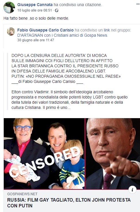 Ma non solo. Il profilo Facebook di Cannata mostra una persona ossessionata dalla sinistra e dalle persone Lgbt. Un’associazione che spesso compare nei suoi post sotto forma di insulto. Riferendosi all’aggressione nei confronti dei ragazzi del Cinema America, ad esempio, Cannata liquida l’episodio come: “banda di gay”. O ancora condividendo una foto di Pro-Vita che ritrae la famiglia di Nichi Vendola in compagnia della senatrice Monica Cirinnà scrive: “Mi viene da vomitare”. Insomma non proprio parole d’affetto verso i suoi “tanti amici omosessuali”. Sulla censura avvenuta in Russia alla biopic di Elton John poi aggiunge: “Ha fatto bene, so solo delle merde”oppure “Quante merde in giro” riferito al Toscana Pride.