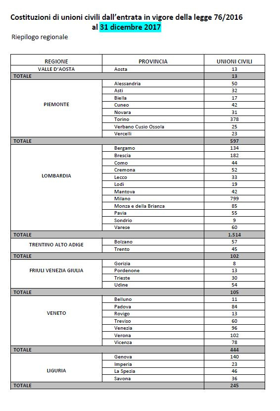Il primato regionale va alla Lombardia, con 1514 unioni celebrate fino al 31 dicembre 2017 (ultima rilevazione del Ministero), seguita dal Lazio (915) e dall’Emilia Romagna (645).