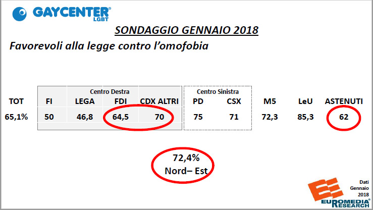 Quanto è diffusa la sensibilità sui temi lgbt tra gli elettori e le lettrici italiane? E soprattutto, com’è distribuito tra le forze politiche l’elettorato tendenzialmente friendly? Mentre ancora non sono pronti tutti i programmi dei partiti e delle coalizioni che si presenteranno alle elezioni politiche del 4 marzo, a rivelare questo dati è un sondaggio svolto da Euromedia Research su commissione del Gay Center.