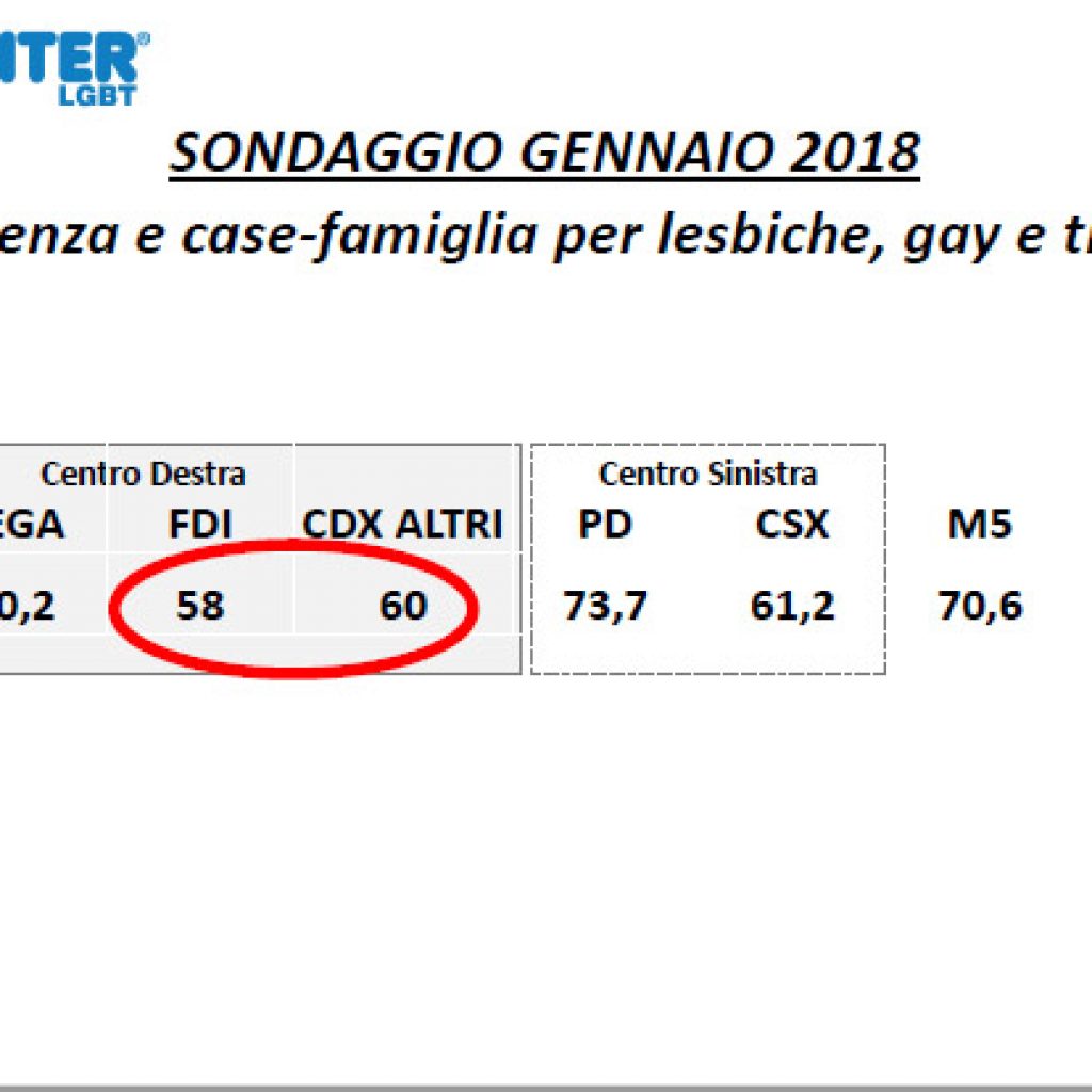 Indagando sui “favorevoli ai diritti ed al sostegno per le persone lesbiche, gay e trans”, l’istituto rileva che il dato maggiore di riscontra tra chi vota Liberi e Uguali (85,3 per cento) mentre quello più basso è tra chi preferisce la Lega (48,9 per cento). Ma a destra ad avere la percentuale più alta è il partito guidato da Giorgia Meloni, Fratelli d’Italia, con il 67,7 per cento. Sebbene la domanda sia piuttosto generica (una politica “a sostegno delle persone lgbt” può avere declinazioni molto diverse, a seconda delle sensibilità degli intervistati), sono le domande successive a chiarire meglio il quadro.