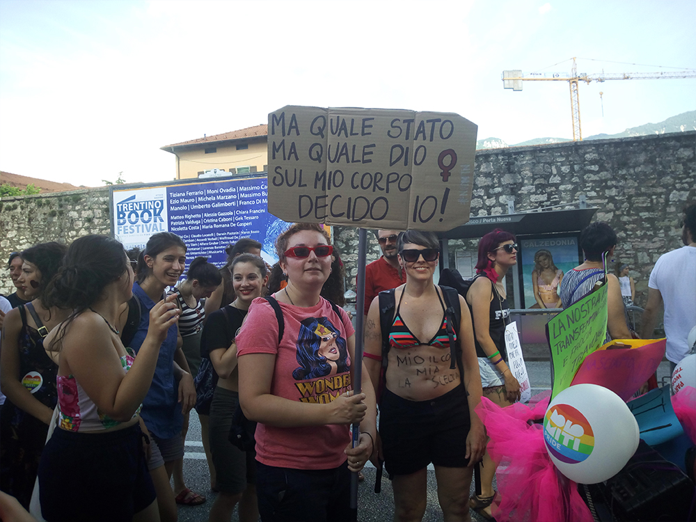 Un pride colorato e tutt’altro che timido sul piano politico. In prima fila, Famiglie Arcobaleno ha aperto il corteo che ha sollecitato il sindaco a perseguire la strada delle trascrizioni all’anagrafe dei figli arcobaleno inserendo entrambi i genitori dello stesso sesso. Non solo. Sul palco nel parco delle Albere si è anche parlato di diritto all’aborto, autodeterminazione, migranti. Fra i tanti interventi, ricordiamo uno stralcio del discorso del gruppo donna di Arcigay Trento: “Dobbiamo essere un baluardo contro i razzisti e chi vuole le donne custodi del focolare -ha dichiarato Michela Papette- né Fontana né le sparute femministe estreme ci toglieranno l’autodeterminazione: cosa sono serviti gli studi di genere se è la biologia a farci donne?”. Un riferimento, nemmeno troppo velato, a certo associazionismo lesbo-femminista -ieri assente- che negli ultimi anni ha dimostrato più vicinanza politica a Casa Pound che al movimento LGBT.