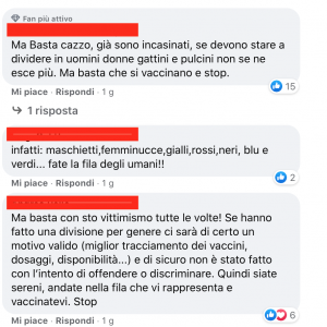 Quindi oggi avrei voluto parlare di questo. Quando, per caso, mi sono imbattuto nella stessa notizia, data da Neg Zone. Do una rapida scorsa ai commenti. Che, permettetemi di dirlo, sono agghiaccianti. «Da lgbt vi dico, state a romp’er cazzo» scrive Sergio. «Ma Basta cazzo, già sono incasinati, se devono stare a dividere in uomini donne gattini e pulcini non se ne esce più. Ma basta che si vaccinano e stop» ci mette il suo, e con una punteggiatura che va fuori dal binarismo “corretto/non corretto” un tale Andrea. «Ma basta con sto vittimismo tutte le volte! Se hanno fatto una divisione per genere ci sarà di certo un motivo valido (miglior tracciamento dei vaccini, dosaggi, disponibilità …) e di sicuro non è stato fatto con l’intento di offendere o discriminare. Quindi siate sereni, andate nella fila che vi rappresenta e vaccinatevi. Stop» scrive un altro utente, ancora.